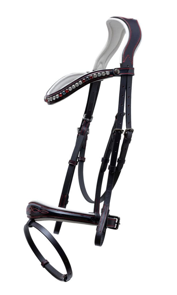 - The Bordeaux – The embodiment of elegant sophistication! Black patent leather, burgundy piping, and black hardware provide the perfect background to highlight the princess cut diamond crystal browband in a stunning ombre design.