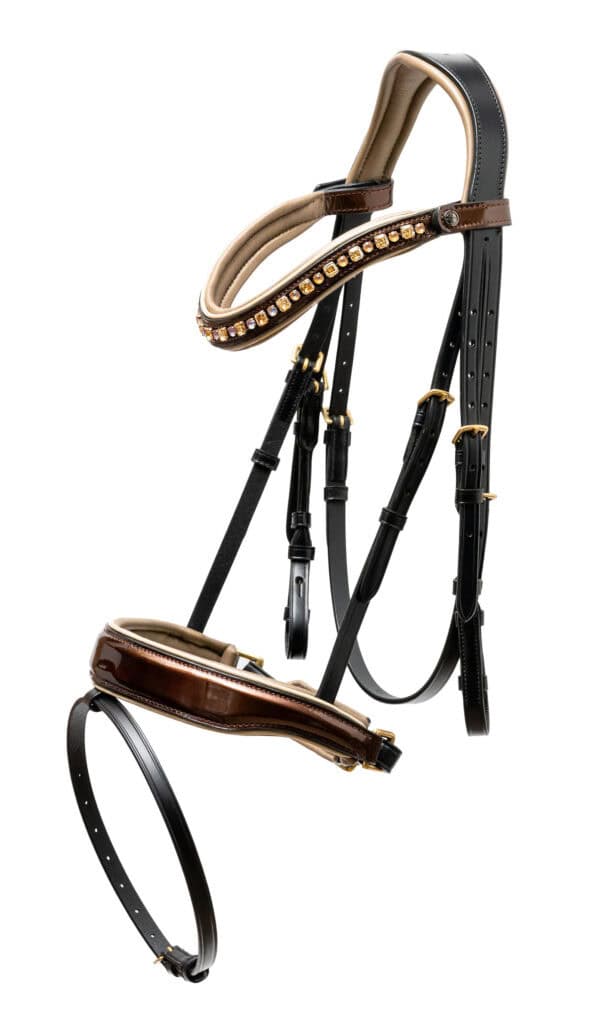 - The Champagne – A scintillating medley of black, metallic bronze, and cream patent leathers topped off with a stunningly unique browband design with different shapes and sizes of crystals in champagne and cream sparkle.