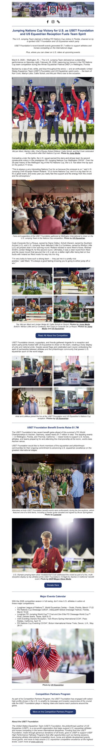 Lexington, Ky. – US Equestrian is pleased to announce the athletes selected to represent the U.S. Jumping Team at the Longines League of Nations™ Ocala CSIO5*-LLN in Ocala, Fla., hosted at the World Equestrian Center from March 17-22, 2026. The team will be led by