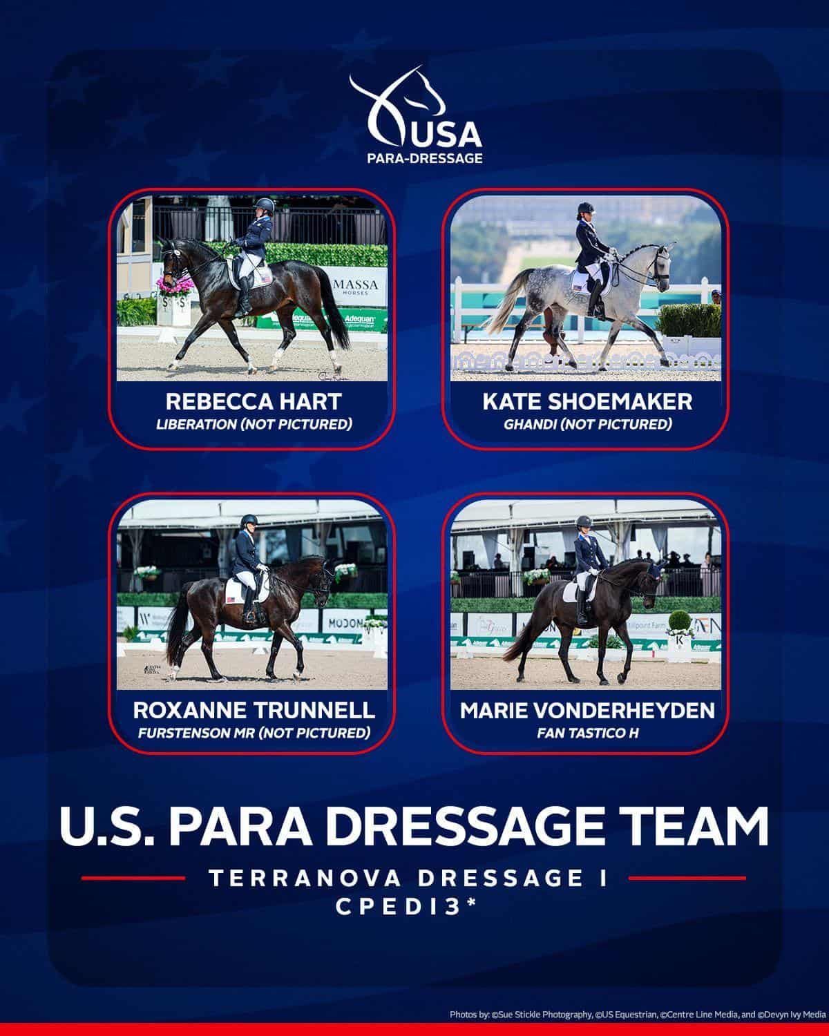 Lexington, Ky. – US Equestrian is pleased to announce the four athlete-and-horse combinations selected to represent the U.S. Para Dressage Team at the TerraNova CPEDI3*. The CPEDI3* will take place April 1-4, 2026, at the TerraNova Equestrian Center in Myakka City, Fla.