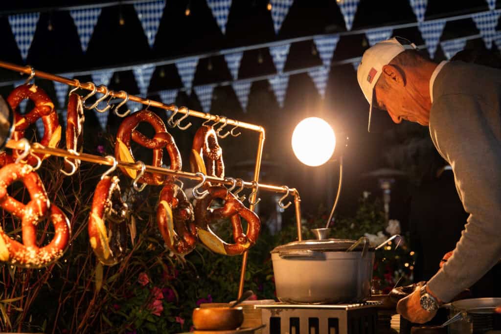 Veteran U.S. dressage athlete Guenter Seidel enjoys the German-themed evening with pretzels. Photo by DIHP/Megan Giese Media